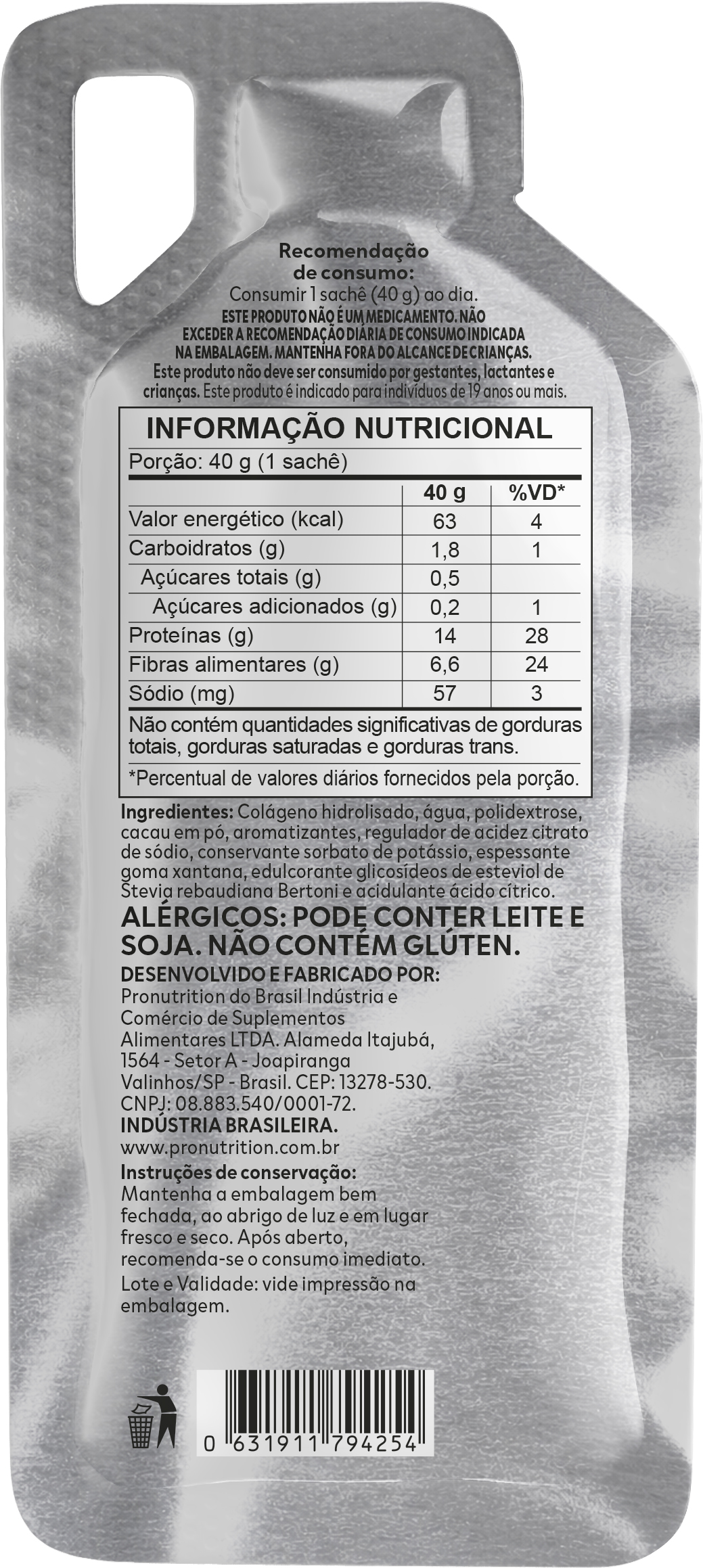 Aromatizantes, Cacau em pó, Colágeno hidrolisado, Conservante sorbato de potássio, Polidextrose, Espessante (goma xantana), Regulador de acidez citrato de sódio, Água purificada -